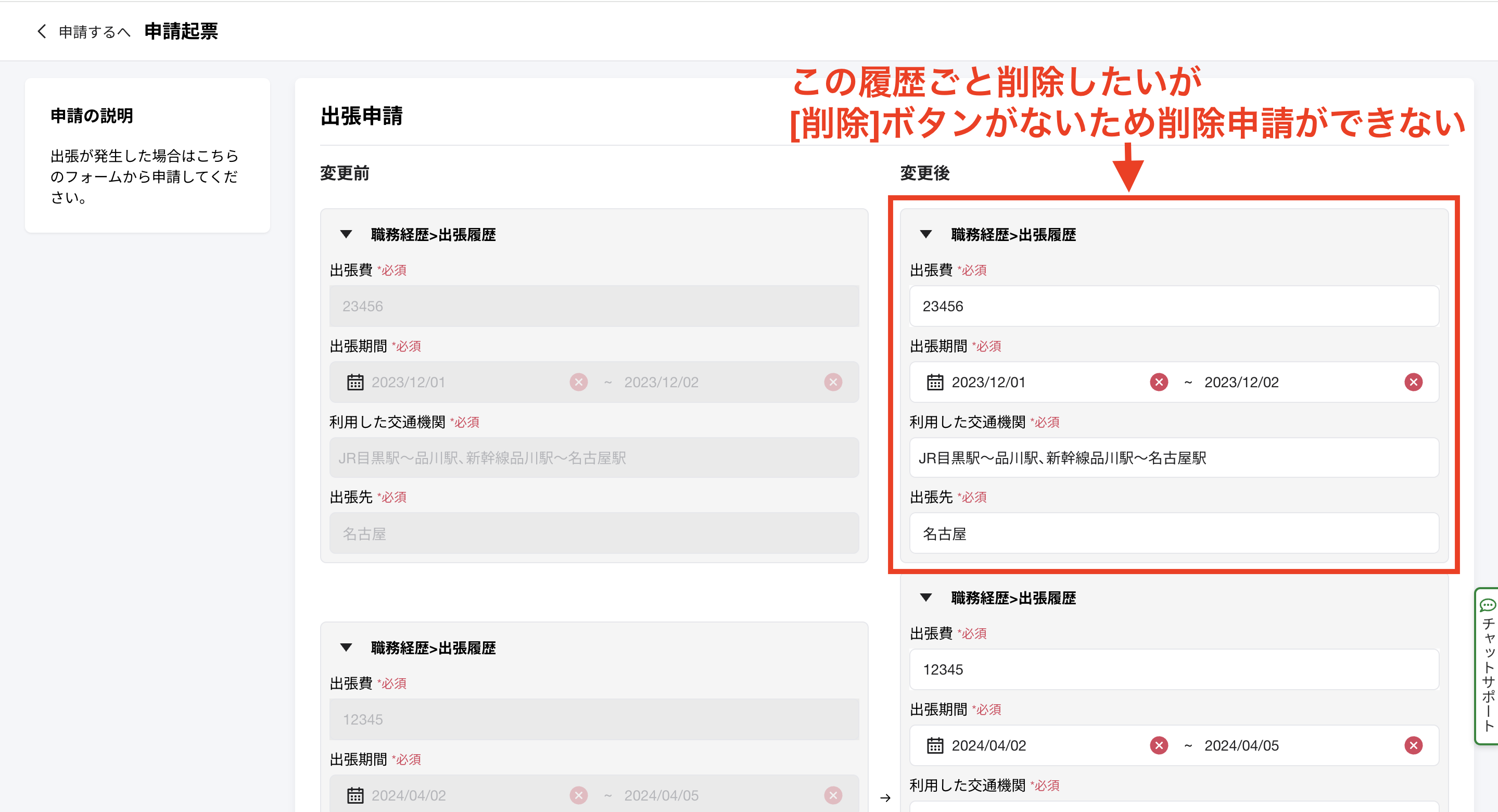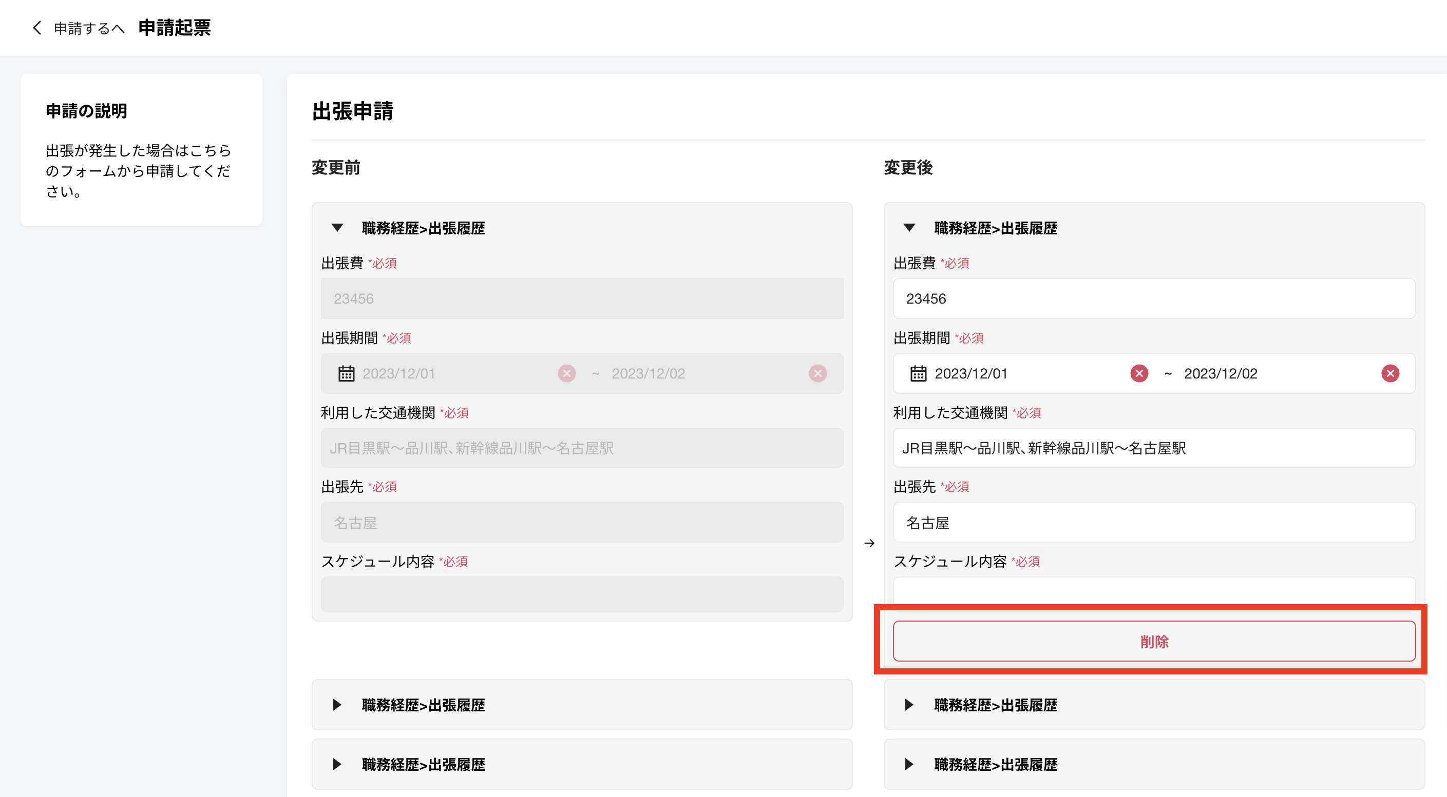 全ての項目を申請項目として設定することで申請画面に[削除]ボタンが表示され、履歴の削除申請が可能です。