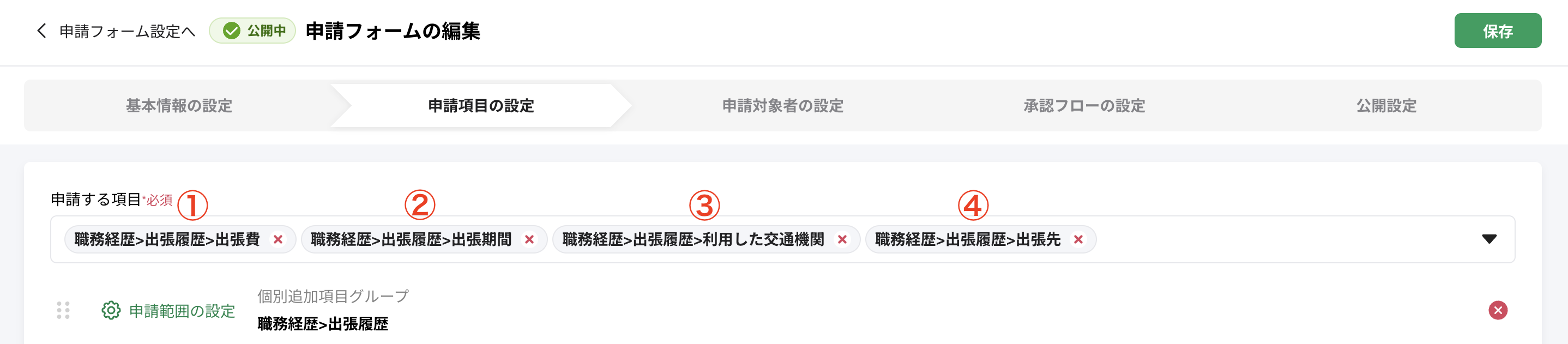 ・[職務経歴>出張履歴] のうち申請項目として設定されているのが4つの項目のみ