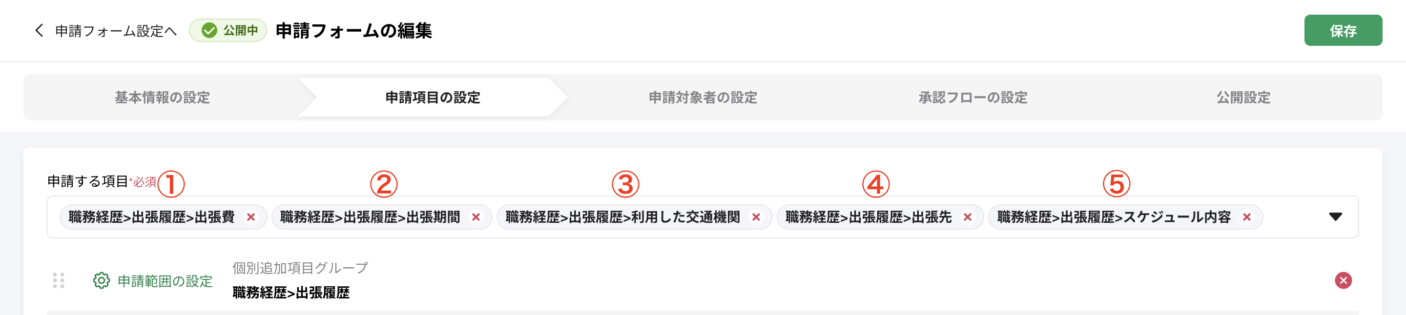 個別追加項目内の全ての項目を申請項目として設定していますか?