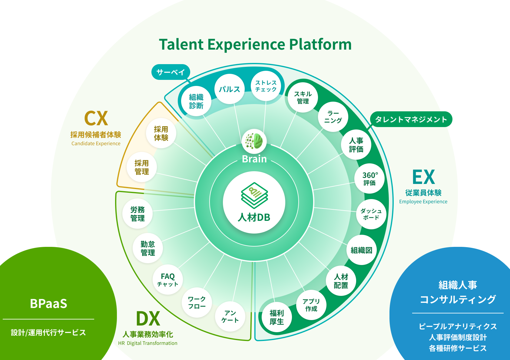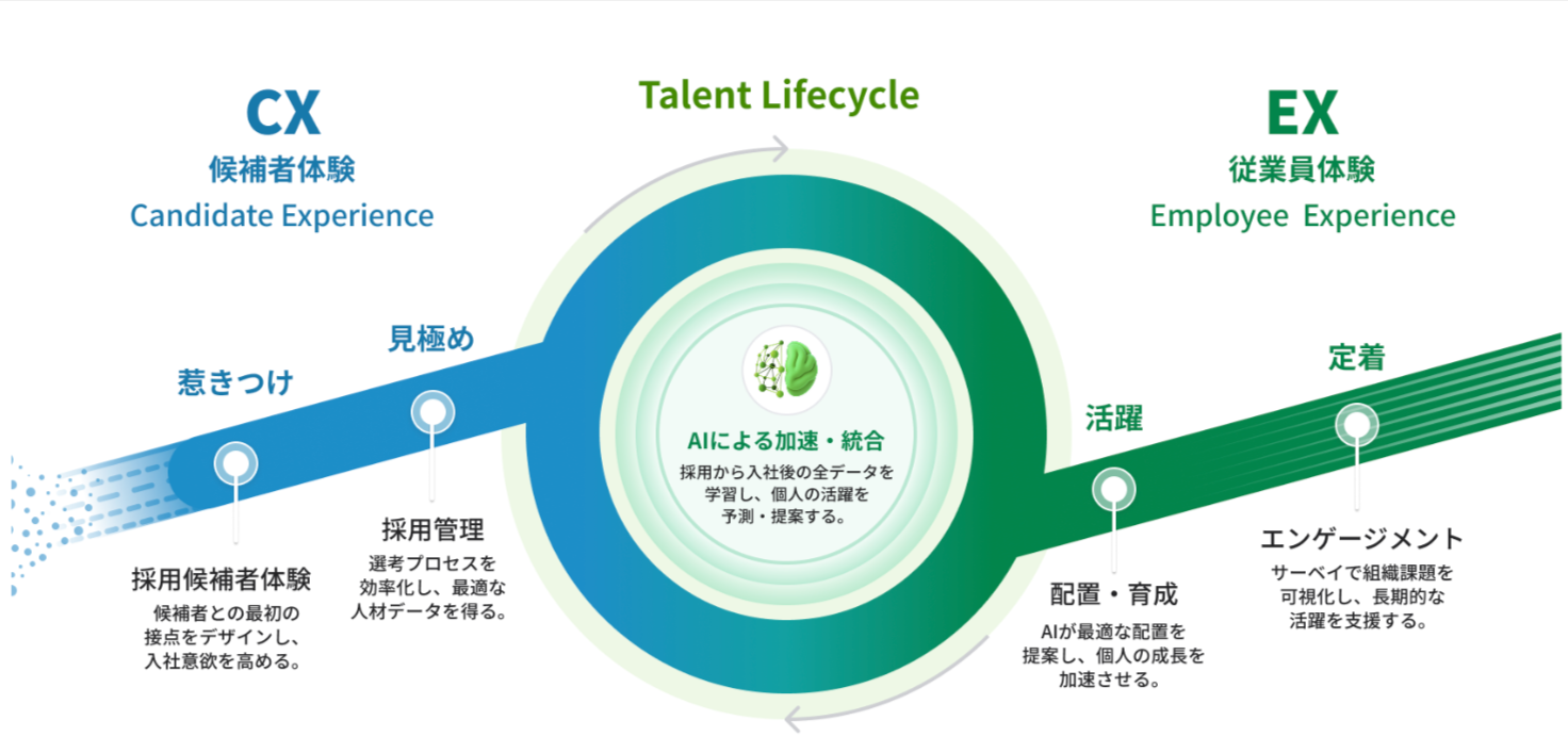 コンセプトにあわせて、提供サービスも多岐にわたっており、CX(採用候補者体験)、EX(従業員体験)、DX(人事業務効率化)の3つの領域でソリューションを提供しております。人材DBを核に各サービスが連携することで組織の可能性を最大化します。