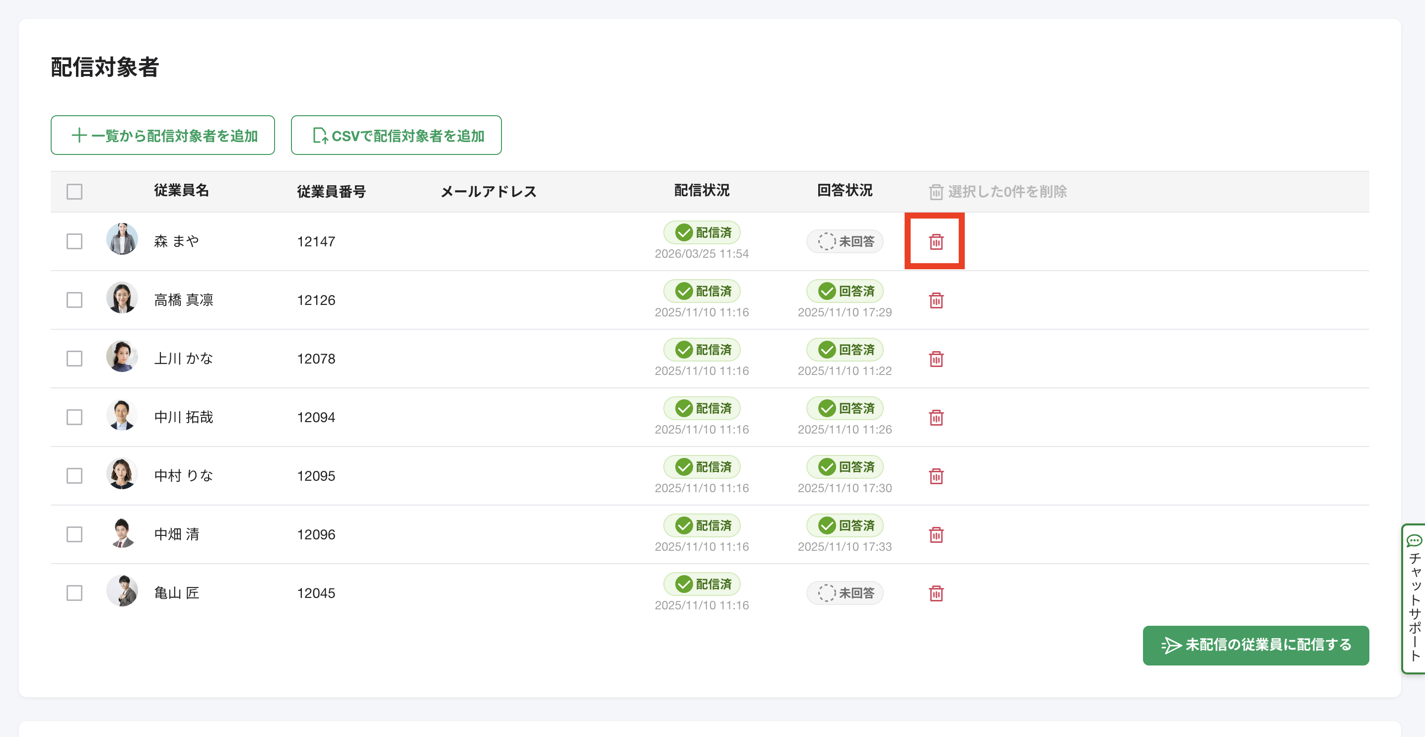 [配信対象者]一覧から該当メンバーの[ゴミ箱マーク]をクリックして削除