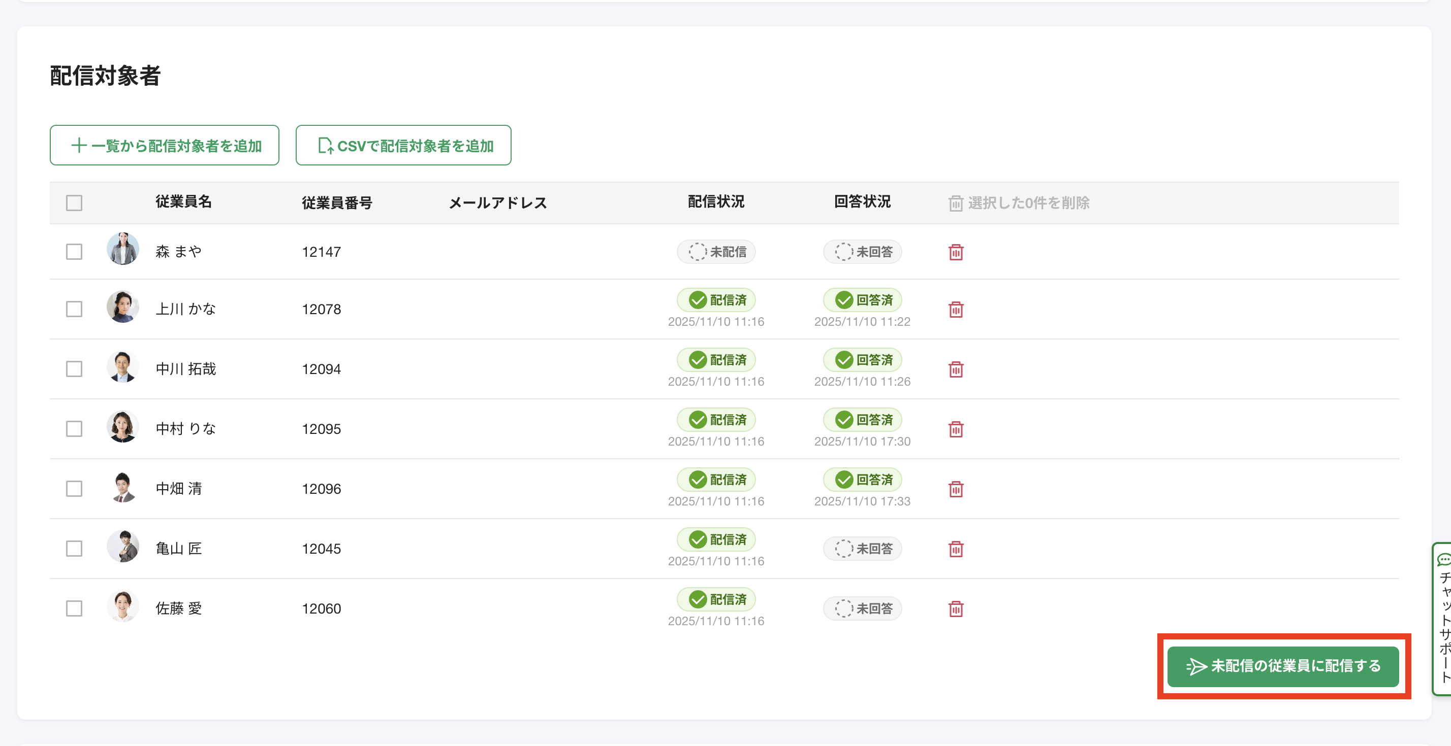 配信状況が「未配信」となるため、[未配信の従業員に配信する]をクリック