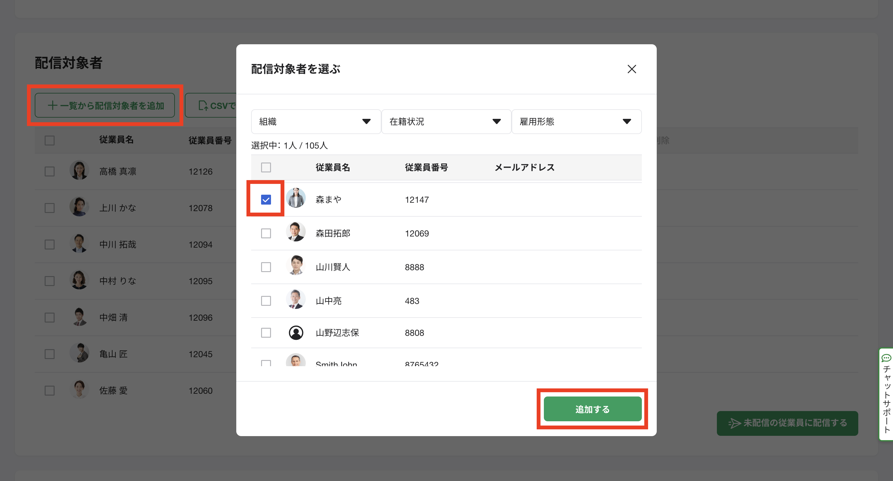 [+一覧から配信対象者を追加]をクリックしてメンバーを選択し、[追加する]をクリック