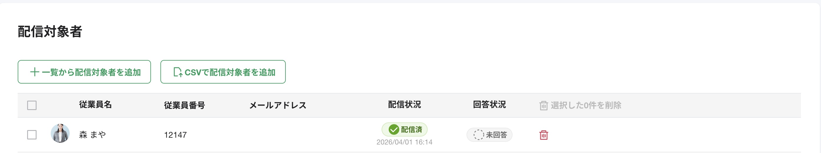 配信対象者から一度削除して再度追加し配信することで回答が可能になります。