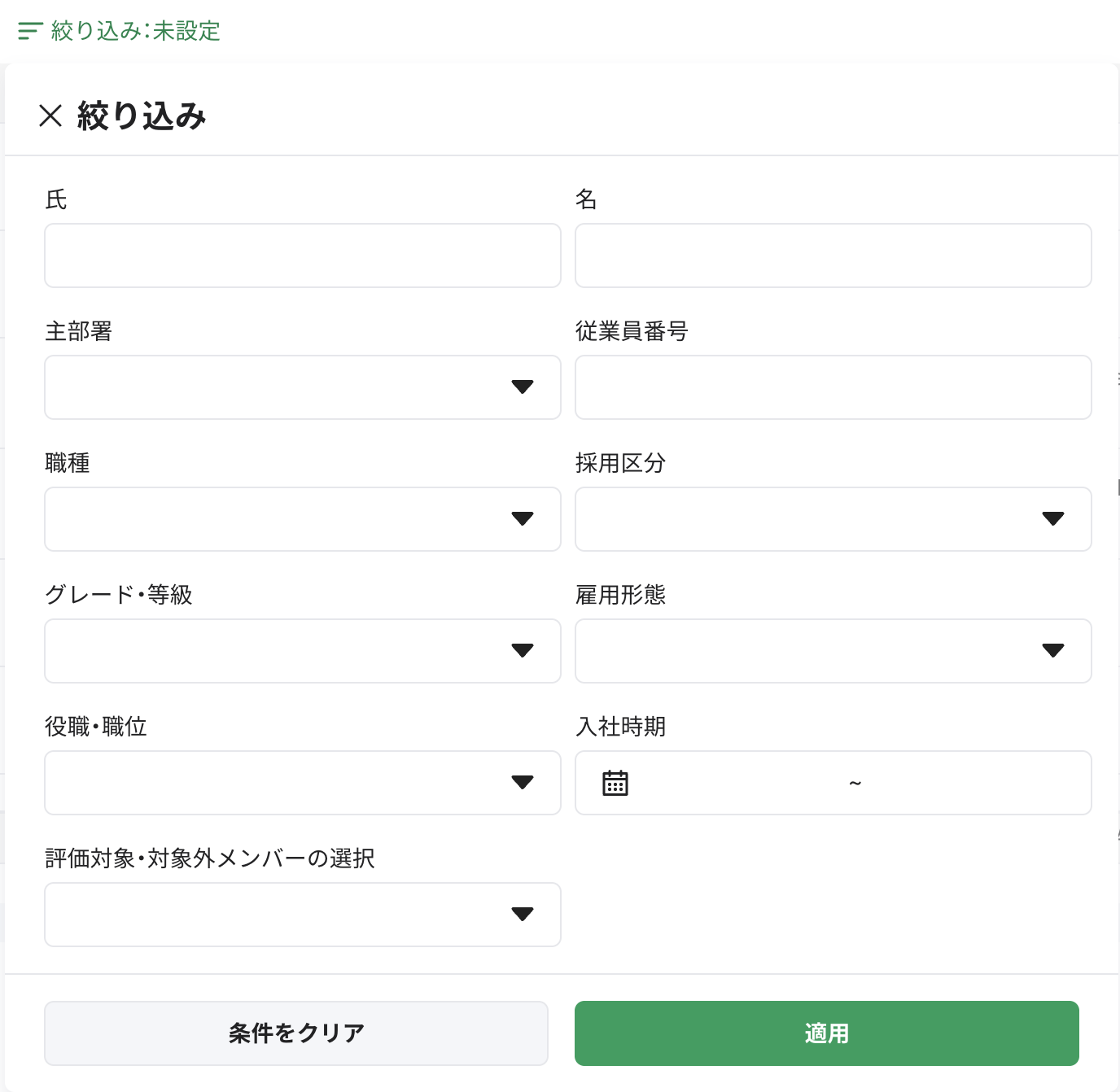評価対象外メンバーの設定で絞り込めるのは添付のいずれかの項目です。