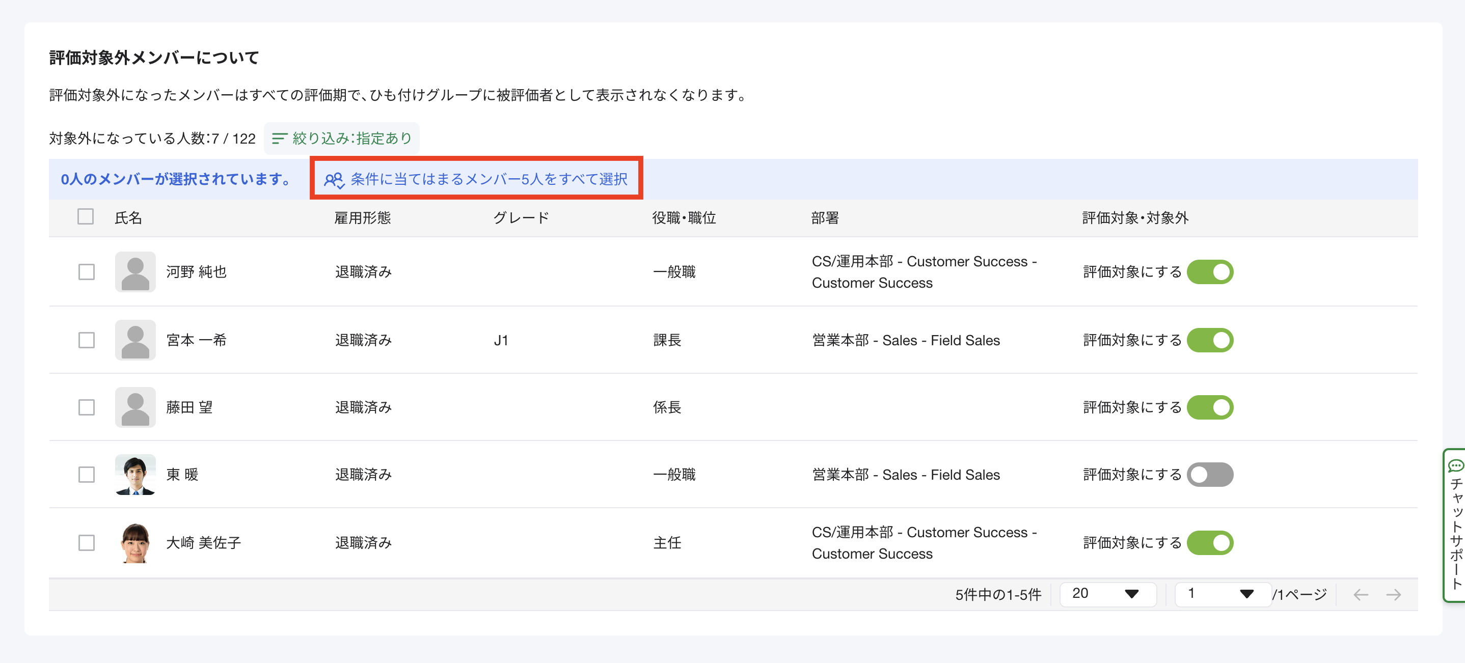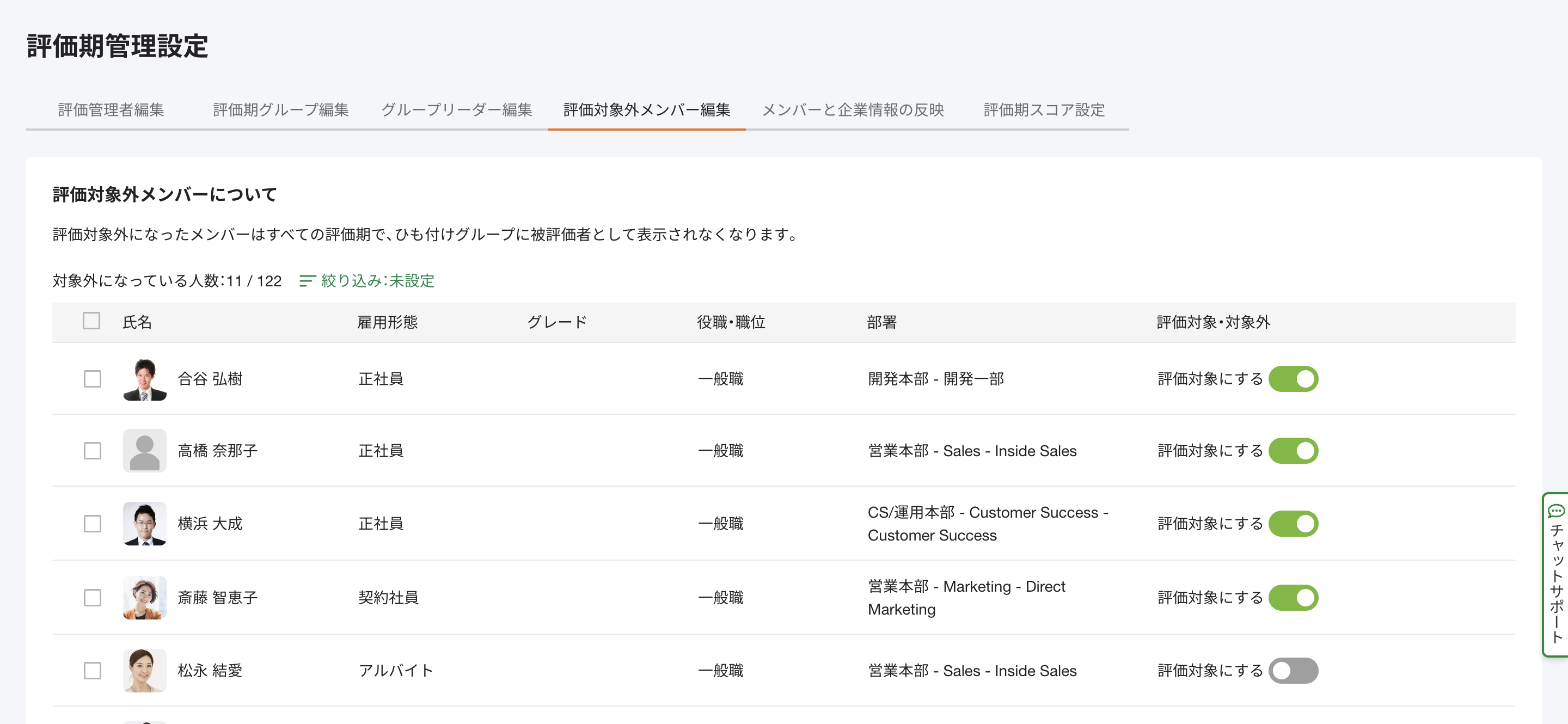 ・評価対象外メンバーの編集で在籍状況を指定して設定できないため、個別に検索して評価対象外に設定している。