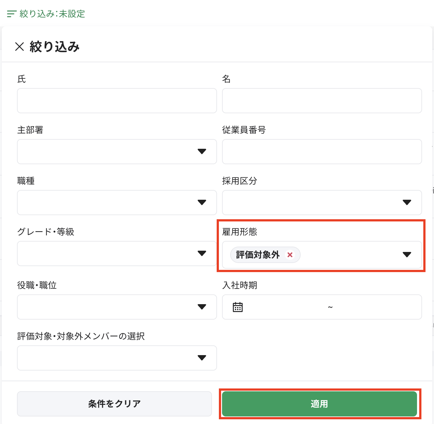 ③人事評価 > [評価期管理設定] > [評価対象外メンバー編集] > [絞り込み]で [雇用形態] の「評価対象外」を選択