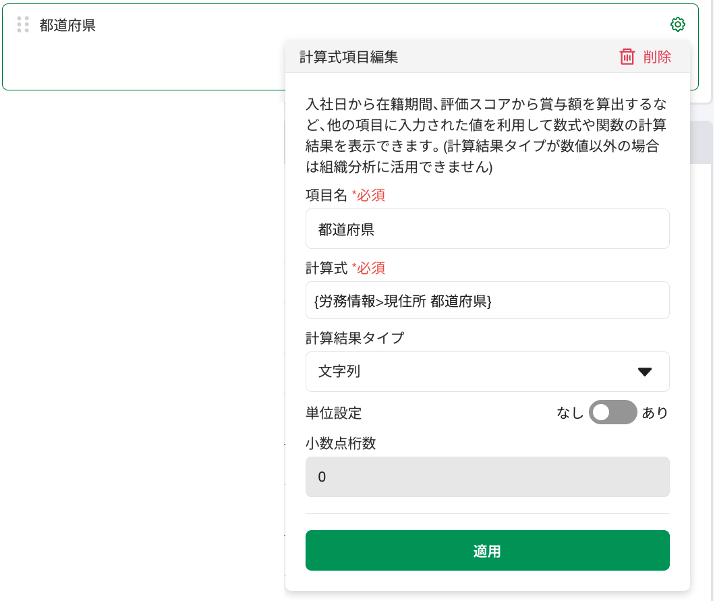 【項目レイアウト編集の計算式設定画面】