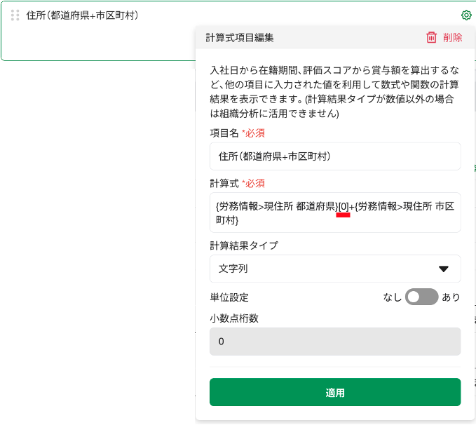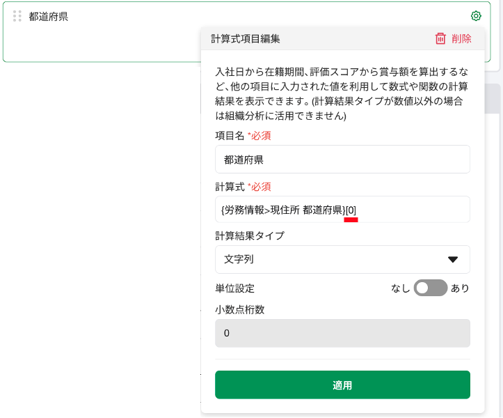 [労務情報>都道府県]項目を参照する計算結果が、[北海道]のように[]がついた状態で表示されます。