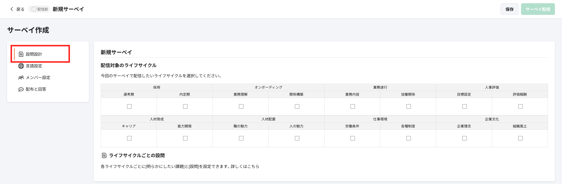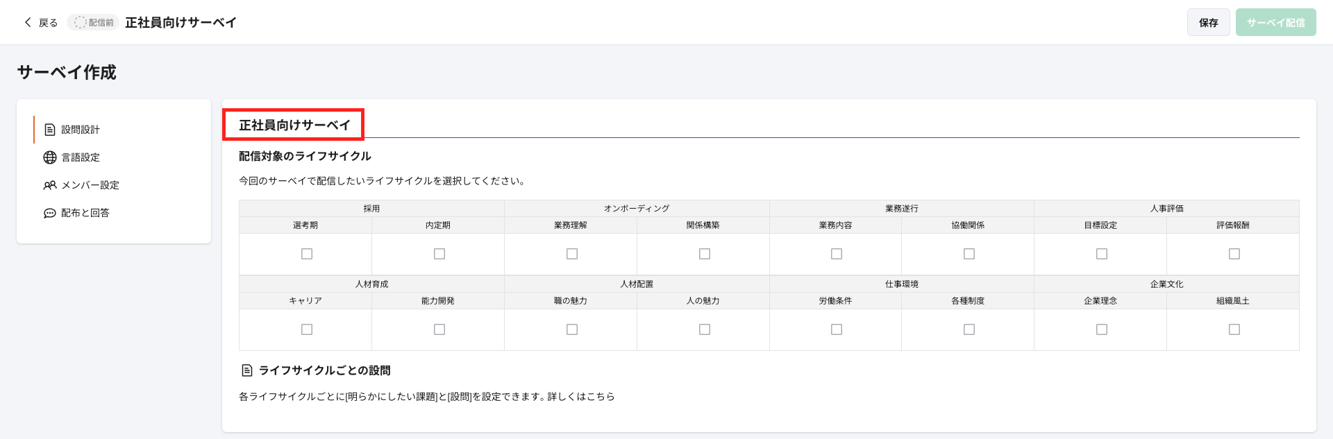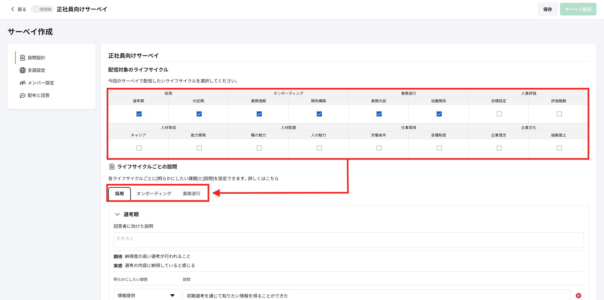 今回のサーベイでどのライフサイクルの設問を配信するかを選択します。