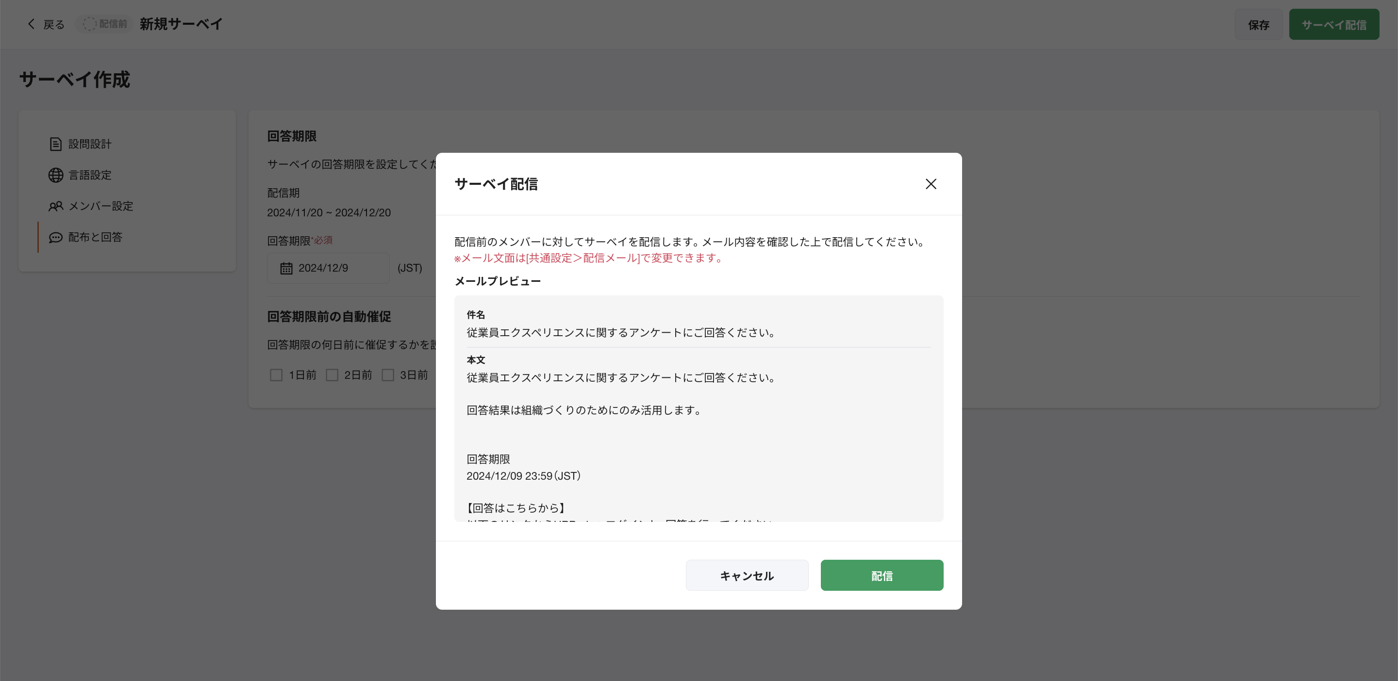 リスク:一度サーベイ配信を行うと、「ライフサイクル」「設問文」「設問数」「言語設定」は後から編集できなくなります。