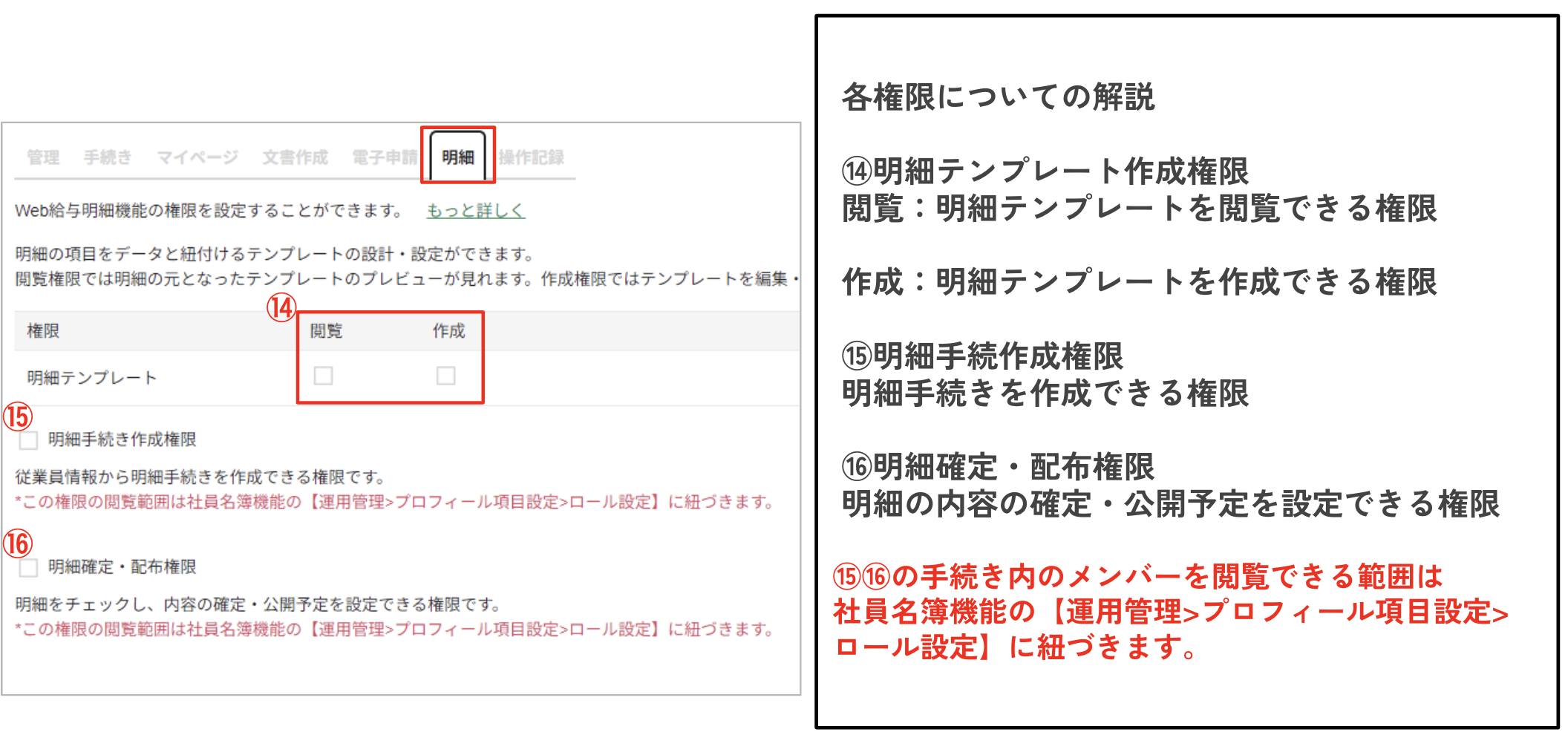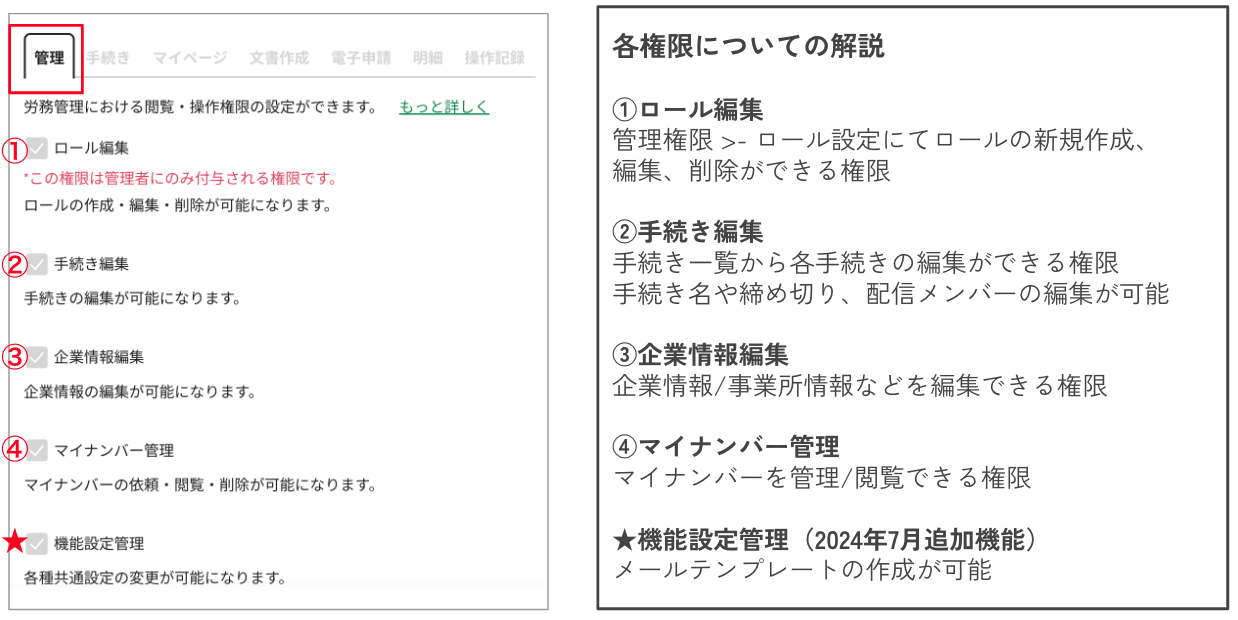 ・④マイナンバーを閲覧・管理するためには⑤手続き権限にていずれかにチェックが必要でしたが、